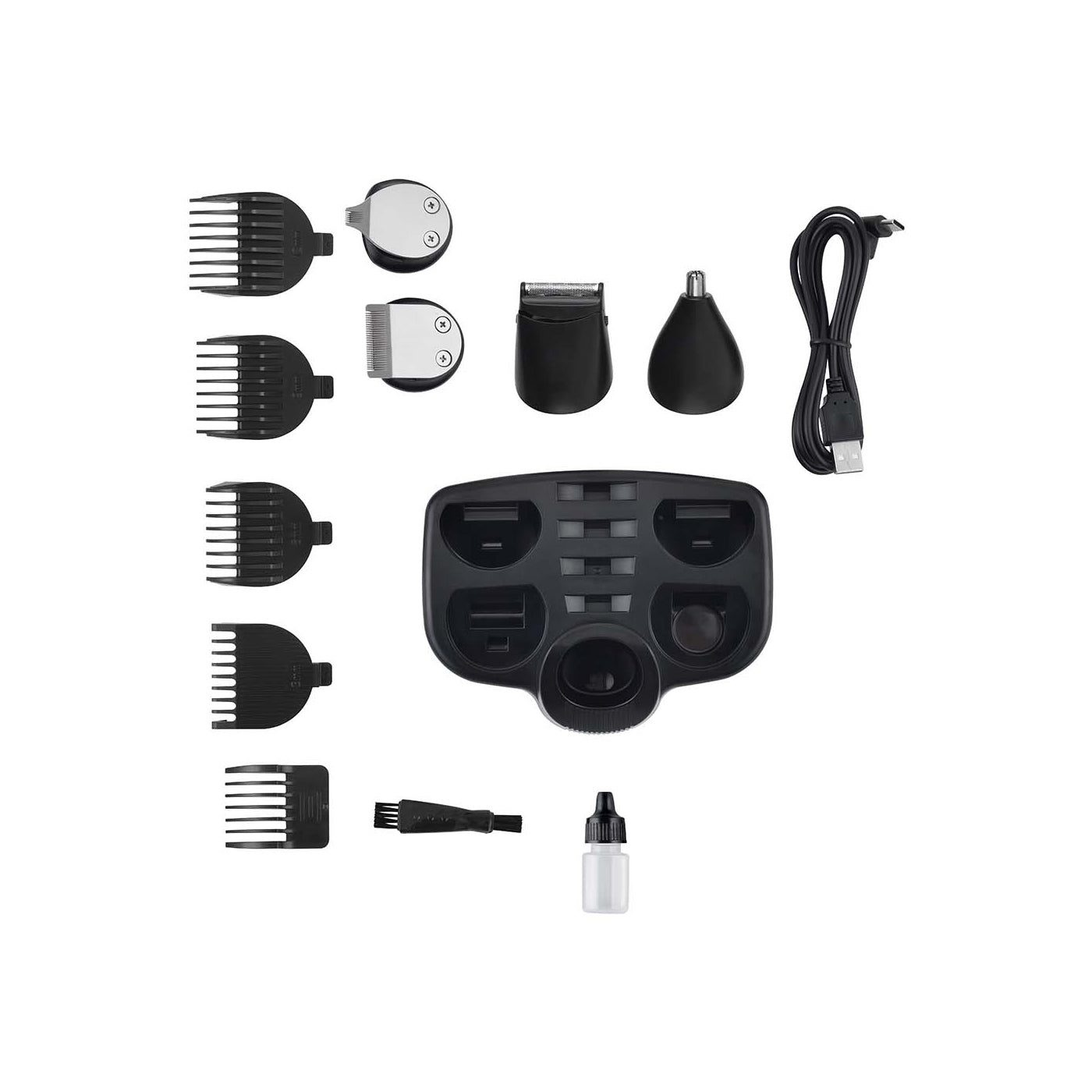 Carga completamente la máquina antes del primer uso. Selecciona el cabezal adecuado según la función que necesites (afeitado, perfilado, recorte, etc.). Si deseas un corte con guía, elige el tamaño que prefieras y ajusta la guía en la cuchilla. Utiliza movimientos suaves y firmes sobre la zona deseada. Limpia los cabezales después de cada uso con el cepillo incluido.